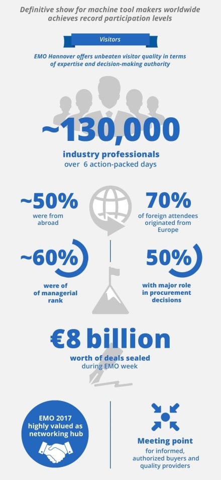 It also attracts visitors with a very high level of decision-making authority and technical expertise. 73 percent of the visitors in 2017 were actively involved in their companies’ decision-making processes – and placed orders worth over 8 billion euros at the show. EMO Hannover’s consistently high number and quality of trade visitors are the result of the organizer’s comprehensive marketing program. Press conferences in over 40 countries in the run-up to the show help to further raise its international profile.